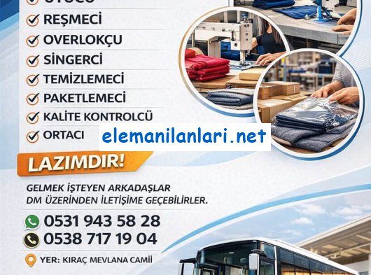 Bünyemizde günlükçü çalışacak ütücü , reşmeci , overlokçu , singerci , temizlemeci , paketlemeci , kalite kontrolcü , ortacı ihtiyacımız bulunmaktadır. İrtibat seçeneklerimiz görsel ile eklenmiştir. İsterseniz günlük , isterseniz haftalık ödemeler yapılmaktadır.